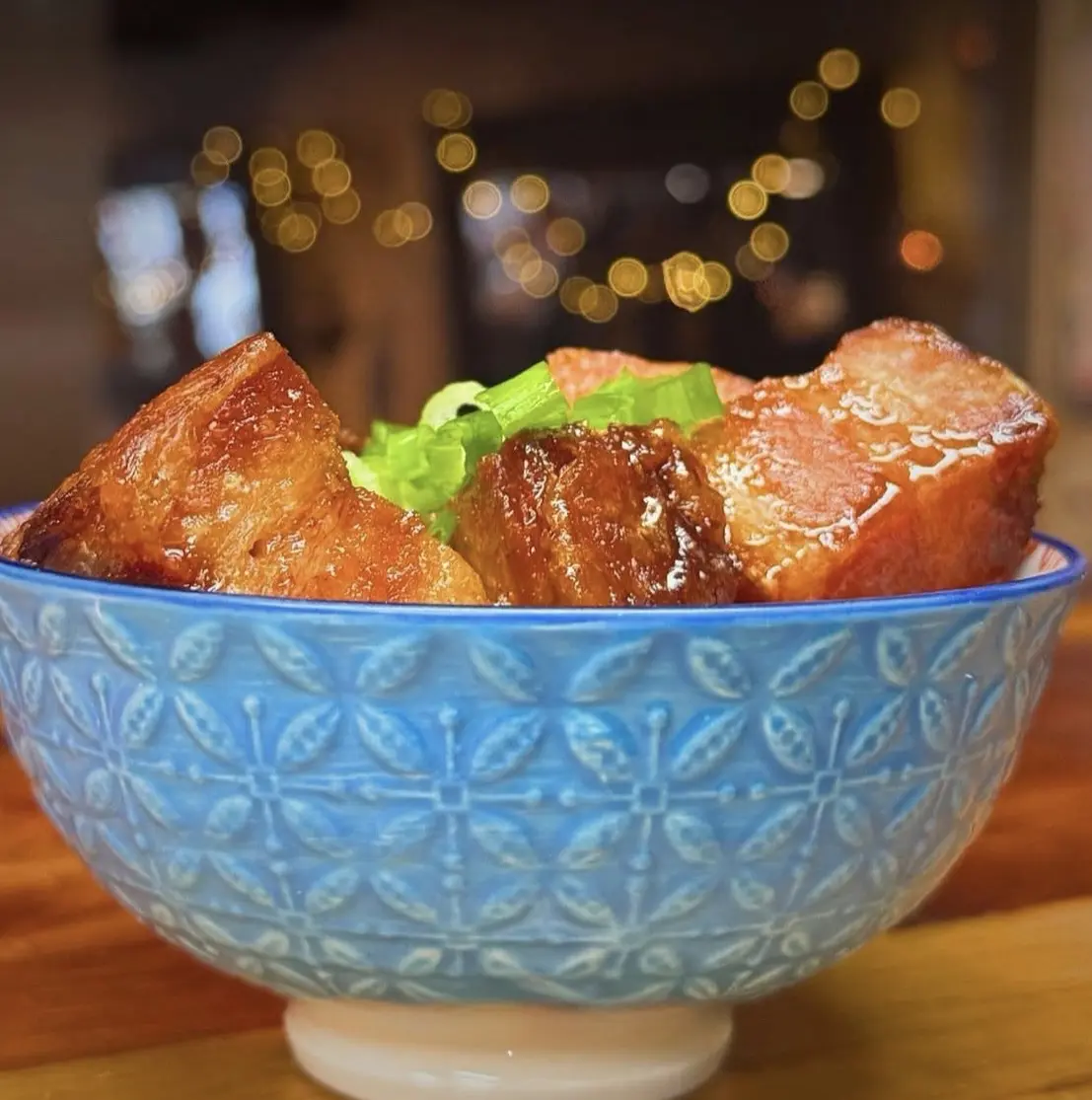 Braised Pork Belly, Shanghai Bok Choy, Green Onion, Cilantro, Chili Oil served with Chicken and Dashi Broth