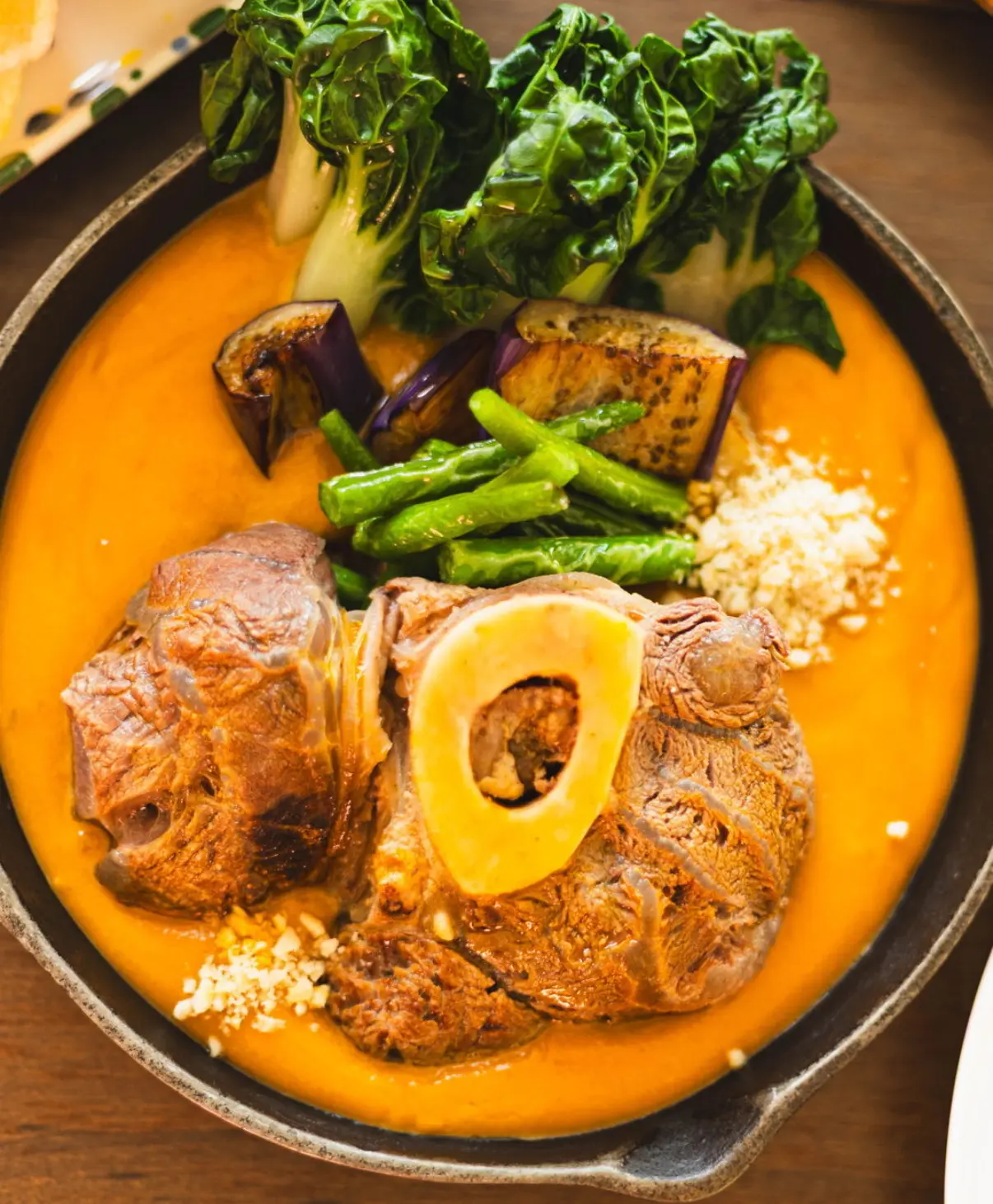 Slow Braised Beef Shank, Bokchoy, Eggplant, And Rich Peanut Sauce