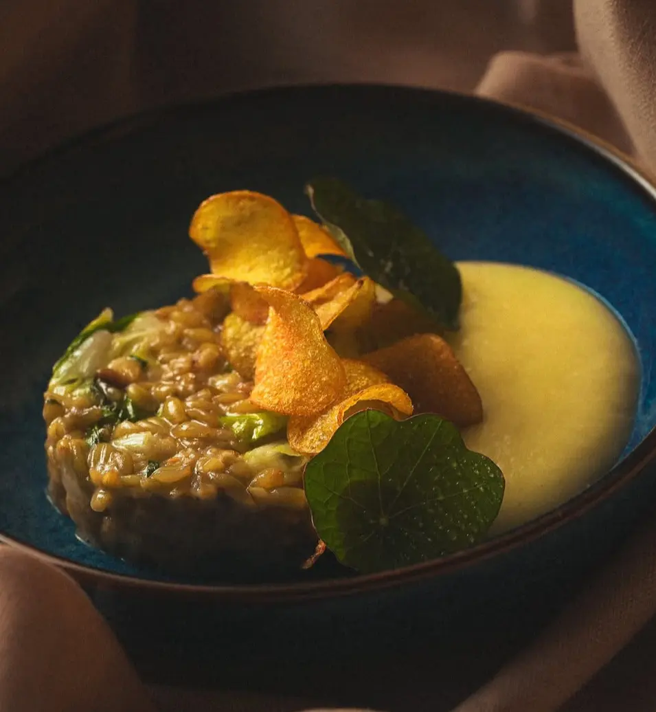 Green farro risotto, chicory and lacto fermented potato mousse, radicchio saurkraut