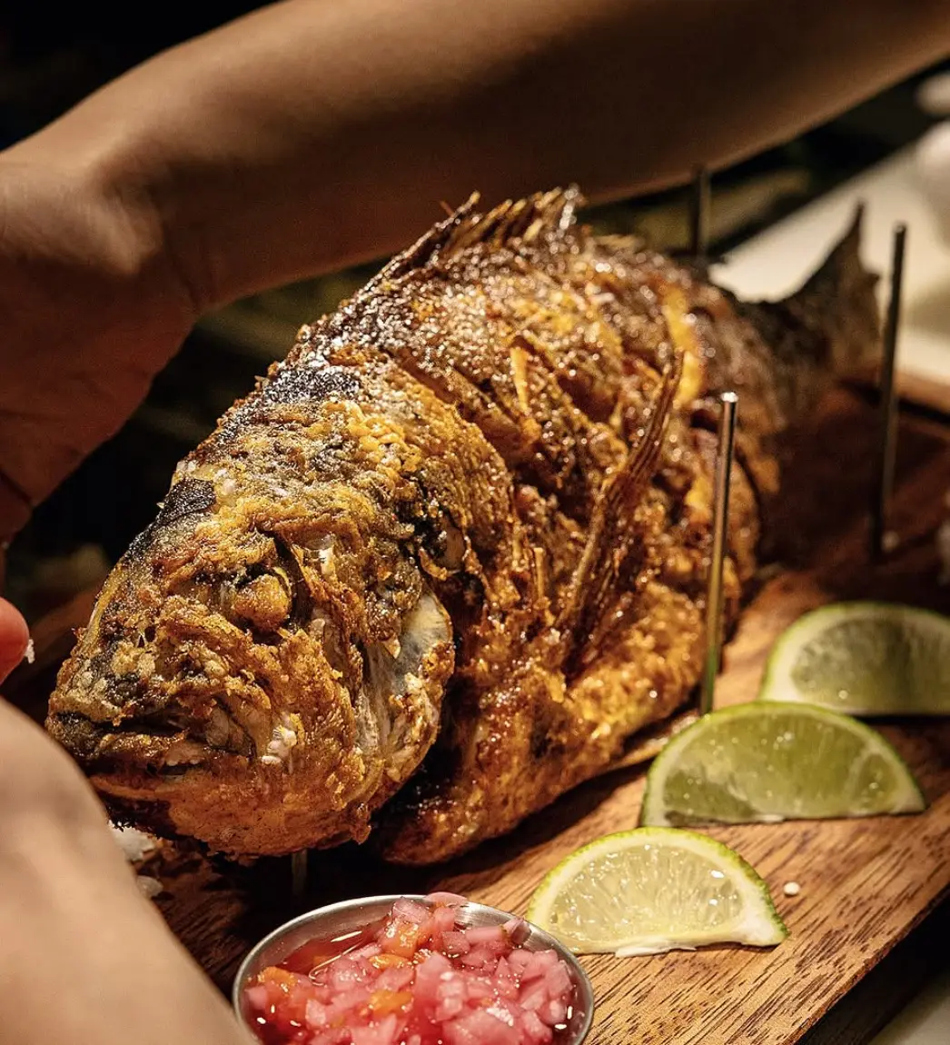 Whole Fried Sea Bream, Sofrito, Salsas Negras & Chipotle Served With A Side Of Garlic Aioil, Mango Xnipec And Corn Tortillas