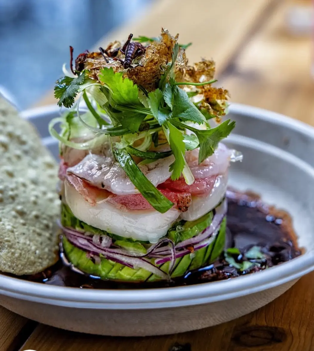 Albacore Tuna Sashimi, Avocado, Tobiko, Sesame Chili Sauce, Prawn Crackers