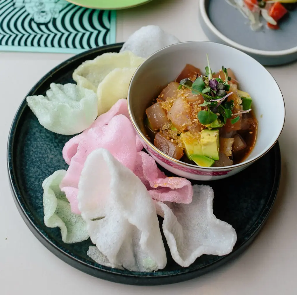 Albacore Tuna Sashimi, Avocado, Tobiko, Sesame Chili Sauce, Prawn Crackers