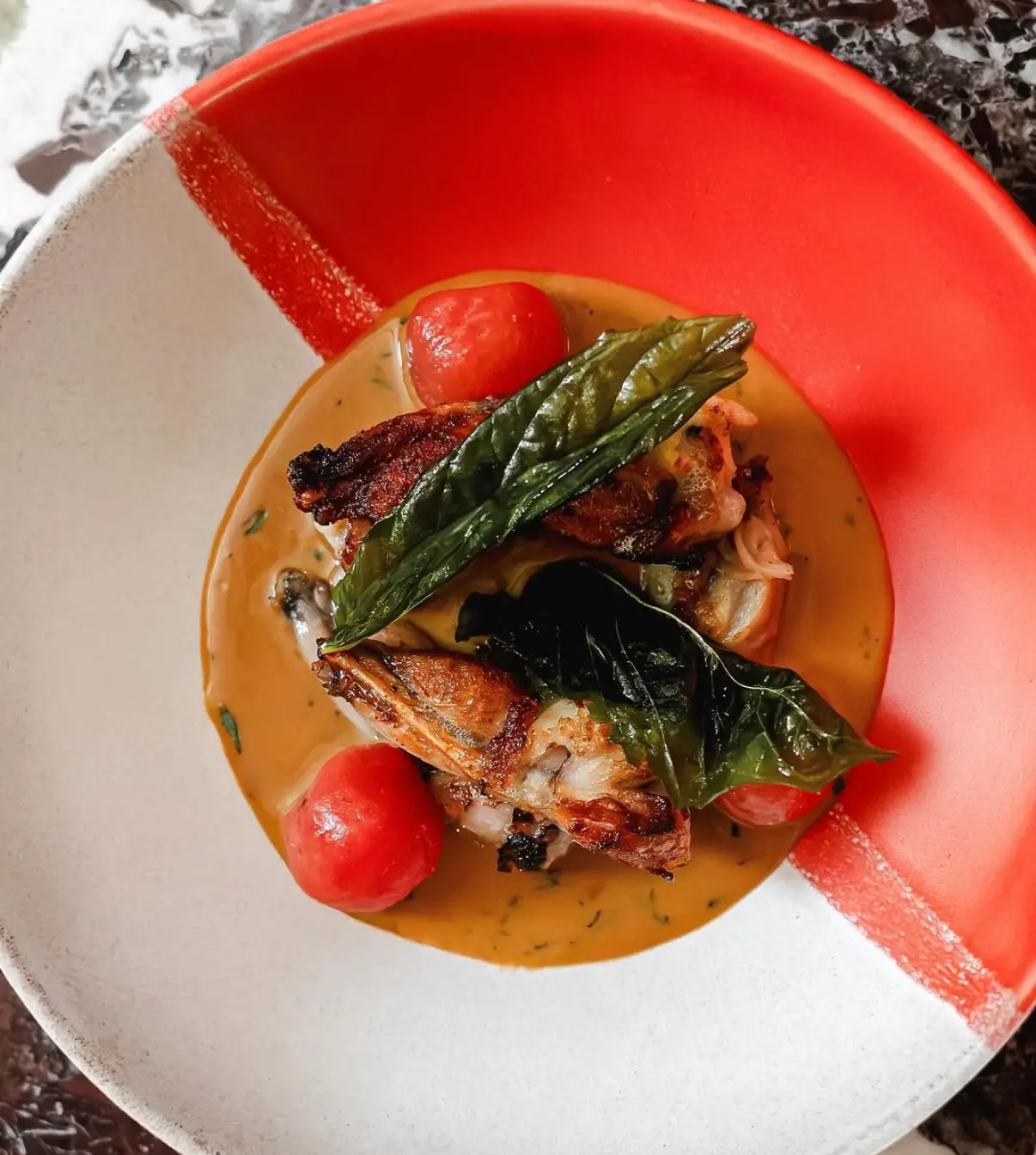 Local Morel Stuffed With Homemade Gyoza Filling Of Pork, Cabbage And Green Onion, With Shiso, Tomato Ponzu, Gorgonzola