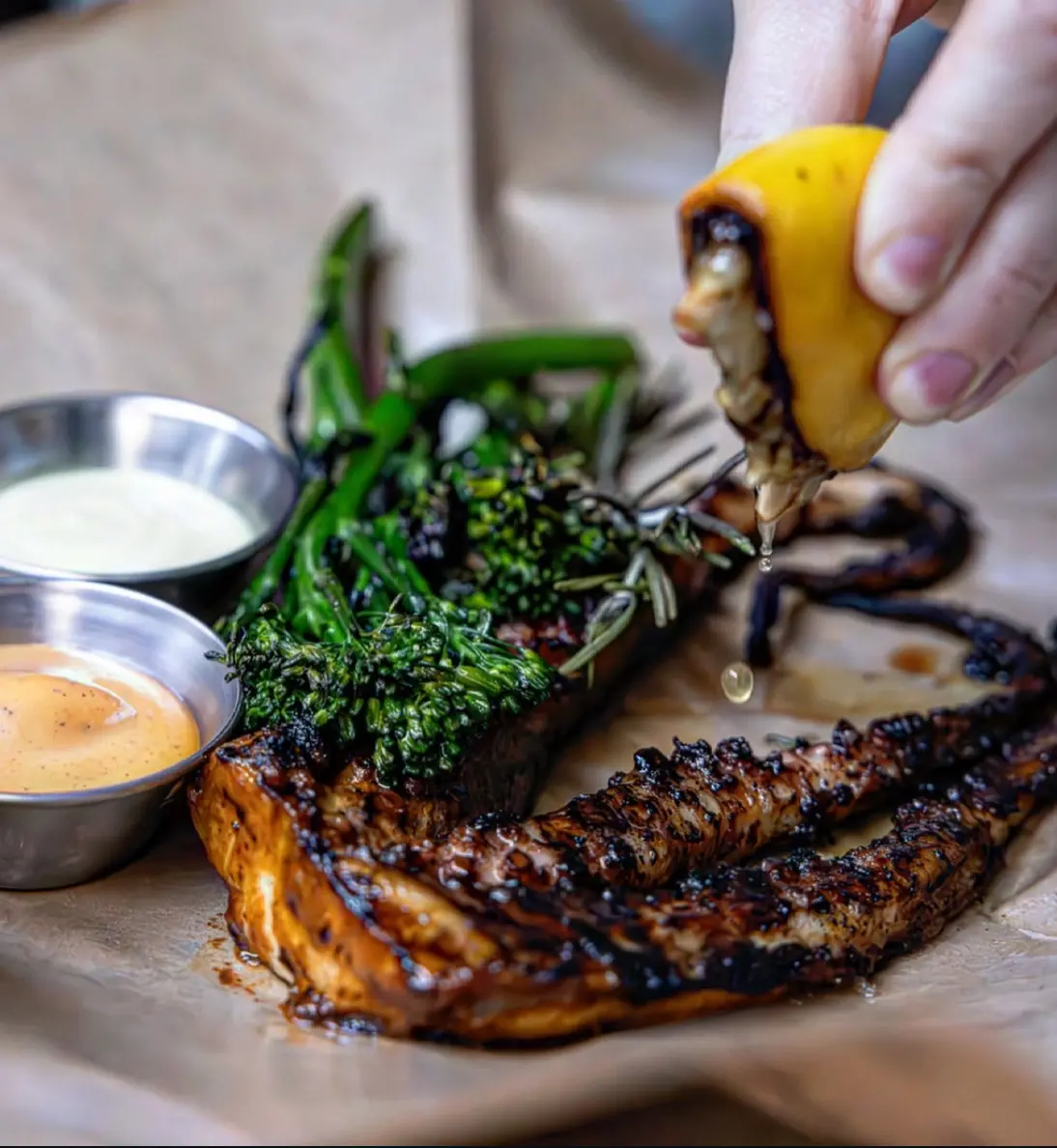 Whole Octopus Tentacle Zarandeado Served With Charred Lemon, Broccolini, Garlic Aioli And Corn Tortillas
