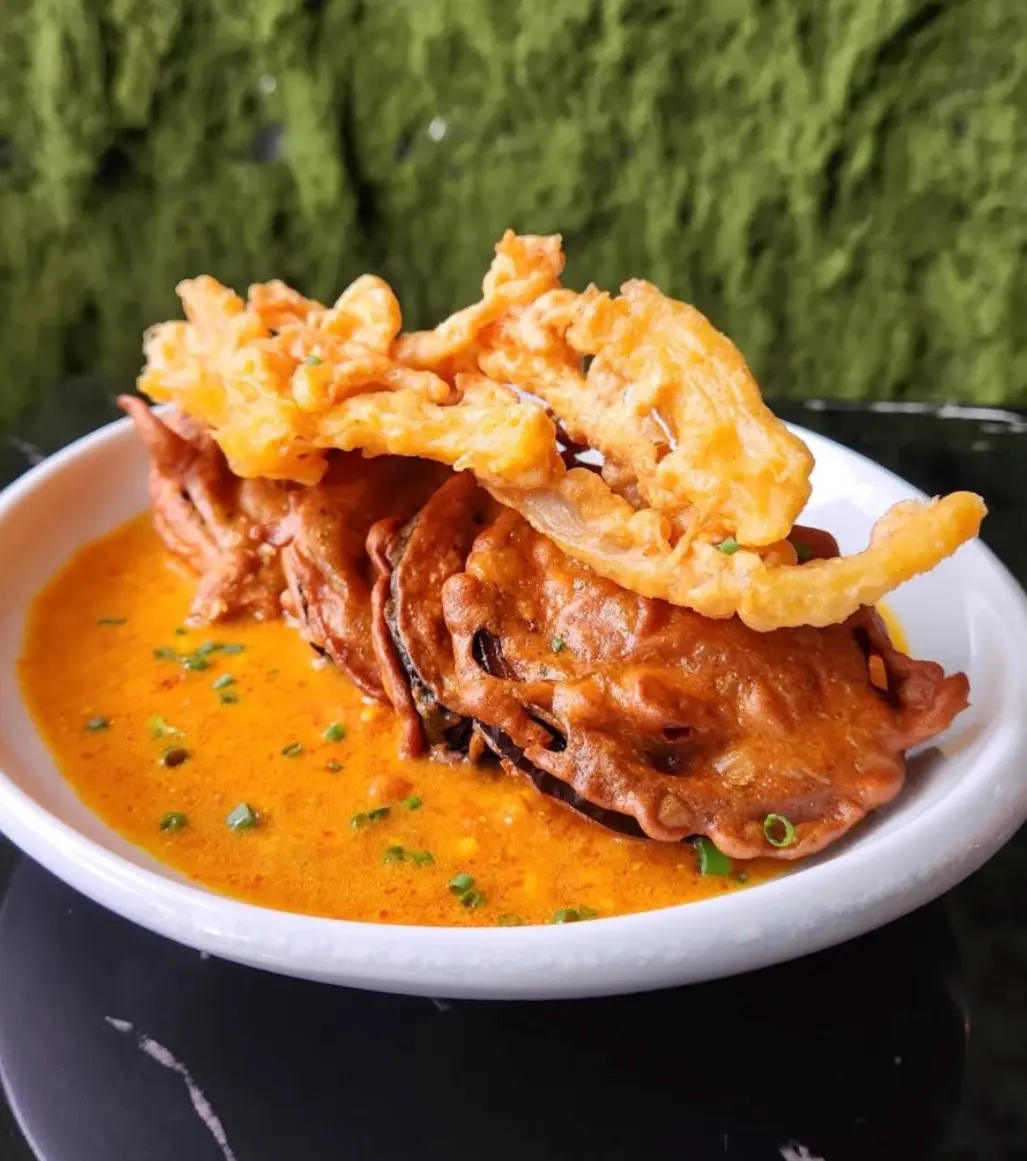 in Thick Yoghurt and Garlic Curry with Onion Rings