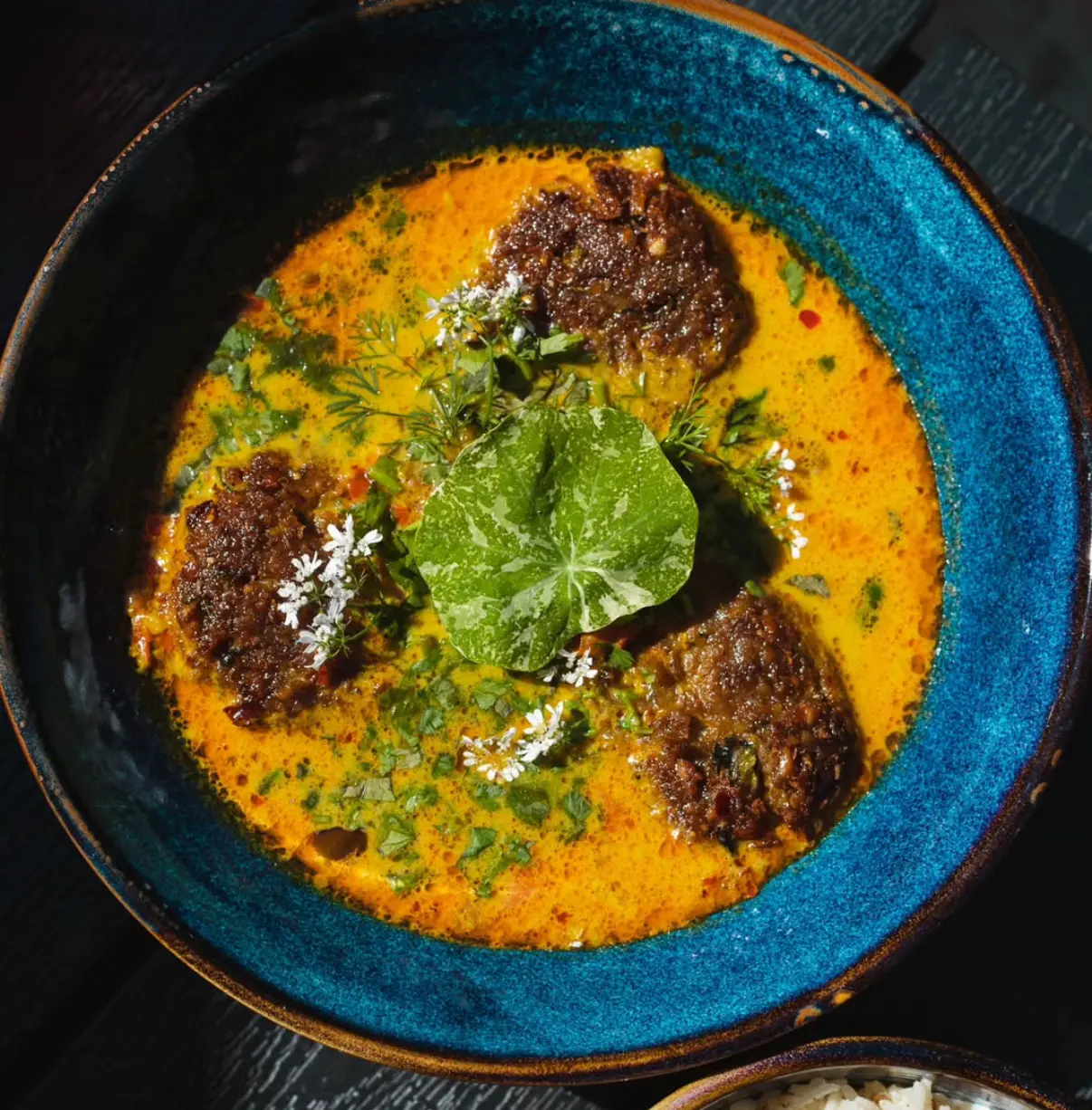 Modern and sustainable Indian dining on Main Street in Vancouver, BC with a playful beverage program and a hidden garden patio. The dining room features lush vegetation and rich textures, bringing the patio garden inside for a cozy and dramatic vibe