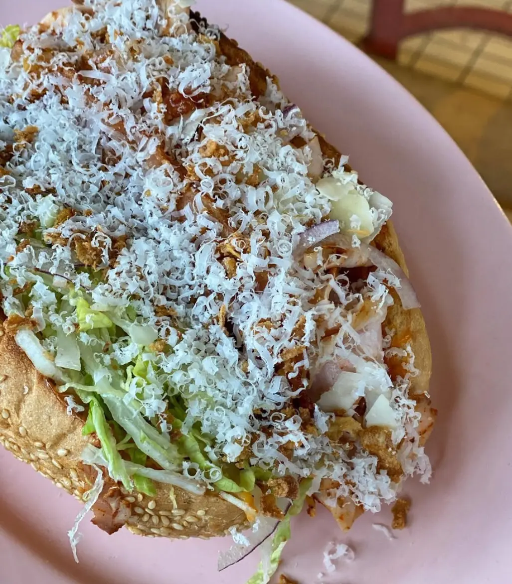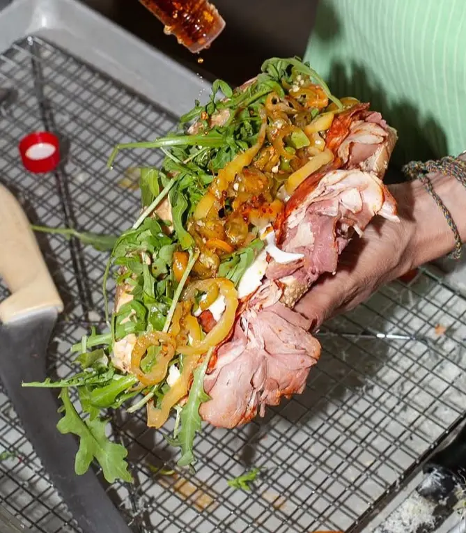 Hot soppressata, Say Hey! Gabagool, fresh mozzarella, smokey chili mayo, pickled serranos, banana peppers, arugula, and chili garlic oil!